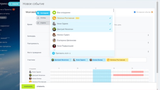 Для каждой встречи автоматически создается чат с сотрудниками, которые должны участвовать в обсуждении.